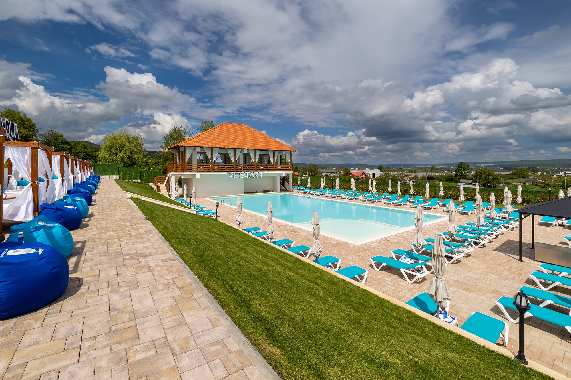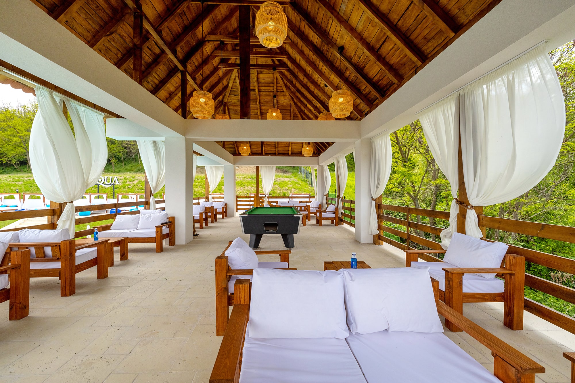 In proximitatea piscinei se afla zona de vestiare si dusuri, iar deasupra acestora, oferind o panorama deosebita atat asupra piscinei, precum si a Vaii Argesului, se afla un lounge acoperit, cu canapele si mese, precum si o masa de biliard.