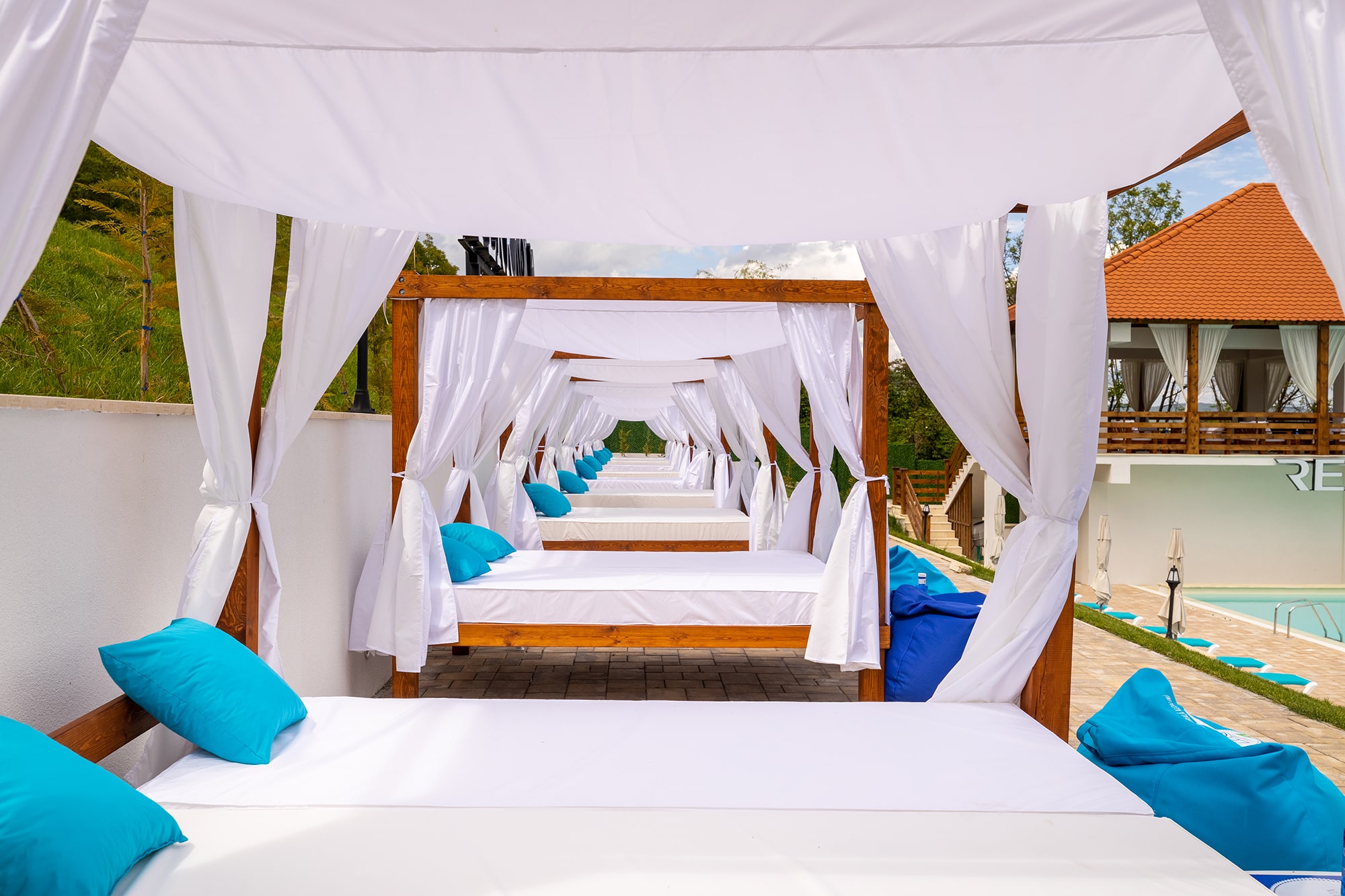 Sunt disponibile pentru inchiriere 100 șezlonguri cu umbrele si 11 baldachine, rezultand o capacitate maxima de 145 adulti. Pentru a se asigura o experienta placuta si relaxanta, accesul este permis exclusiv in aceasta limita. In zona adiacenta este disponibil si un jacuzzi si pufi mobili.